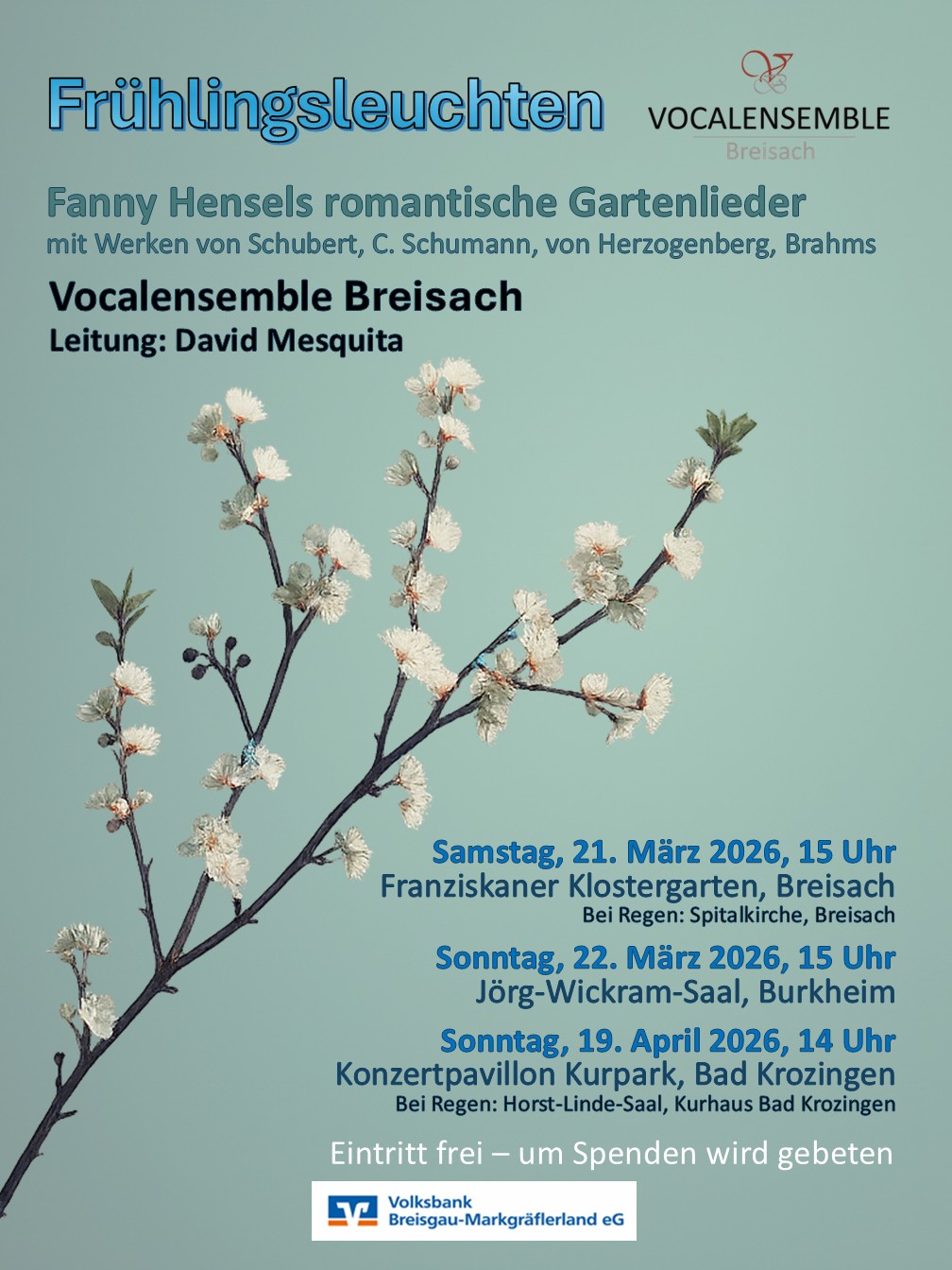 Konzerttermine: Samstag, 21. März 2026, 15 Uhr, Franziskaner Klostergarten, Breisach (bei Regen: Spitalkirche, Breisach); Sonntag, 22. März 2026, 15 Uhr, Jörg-Wickram-Saal, Burkheim; Sonntag, 19. April 2026, 14 Uhr, Konzertpavillon Kurpark, Bad Krozingen (bei Regen: Horst-Linde-Saal, Kurhaus, Bad Krozingen). Eintritt frei. Um Spenden wird gebeten. Weitere Informationen finden Sie auf der Website www.vocalensemble-breisach.de